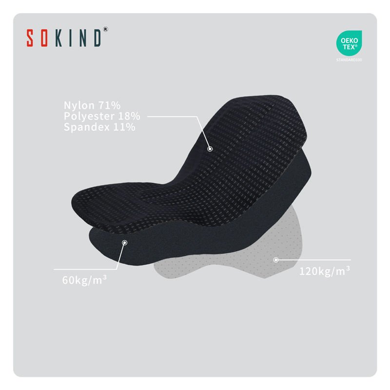 Dual-Density Reticulated Foam Core: Engineered with a specialized two-tier shock absorption system. The 60kg/m³ upper layer provides a gentle, adaptive touch, while the robust 120kg/m³ high-density base powerfully disperses pressure from the sit bones to reduce deep-tissue fatigue.