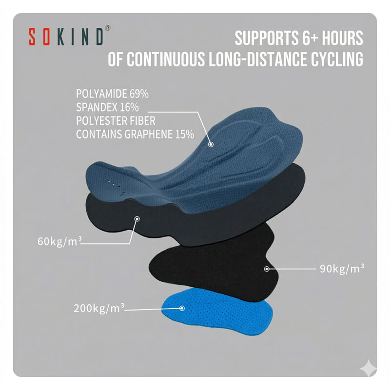 As a specialized manufacturer of premium cycling components, we know that professional riders demand gear that performs flawlessly under extreme conditions. The SOKIND® SK-666-1 Men’s Cycling Chamois is our premier solution for elite bib shorts and endurance wear. Engineered with a cutting-edge graphene fabric blend and a specialized reticulated foam core, this pad is designed to eliminate long-distance soreness and provide your end-customers with over 6 hours of continuous, uncompromising riding comfort.